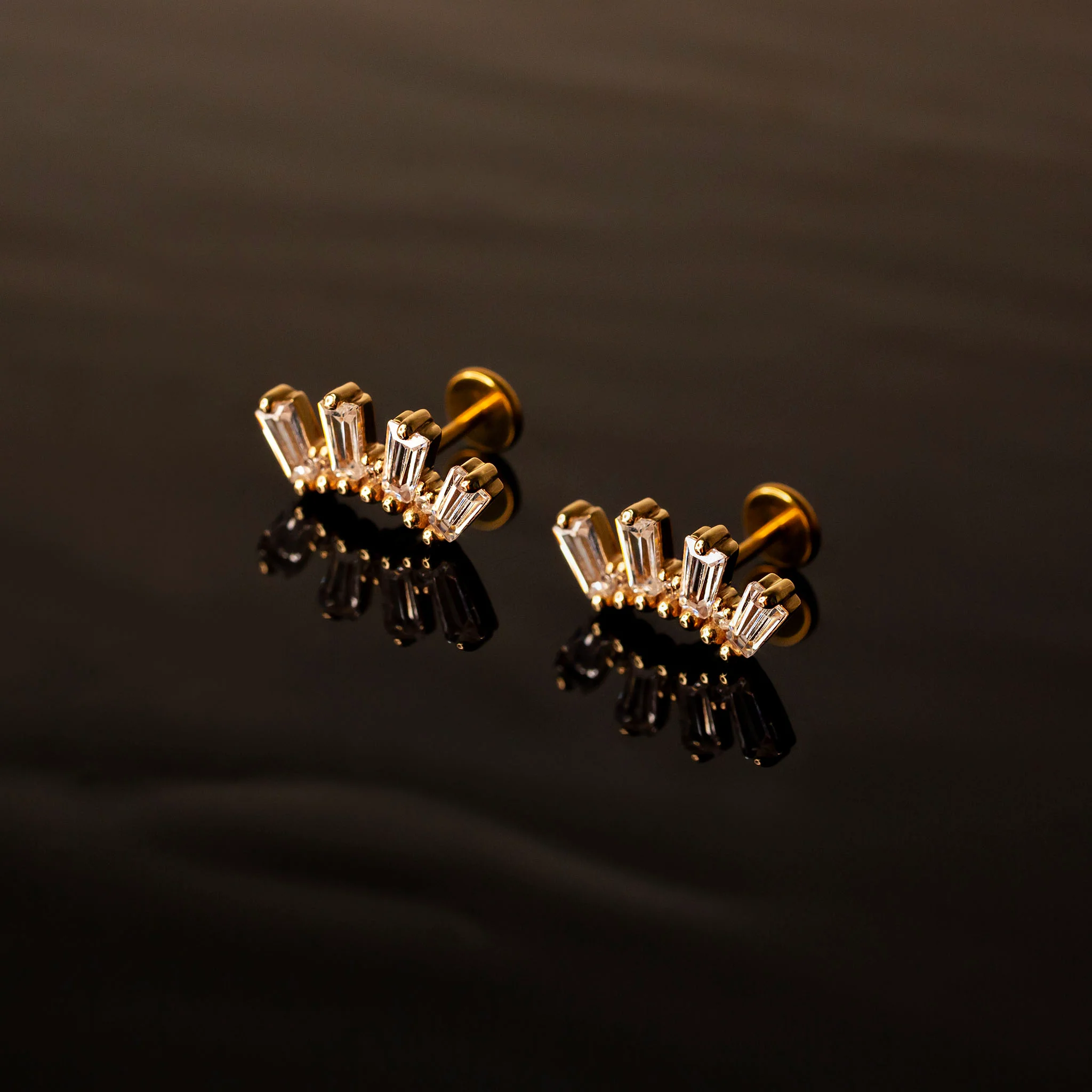Featuring a curved stack of glittering baguette crystals fit for royalty, and wrapped in 14k solid gold, these threadless flat back earrings offer beauty that will last for generationsātruly PERFECTION.