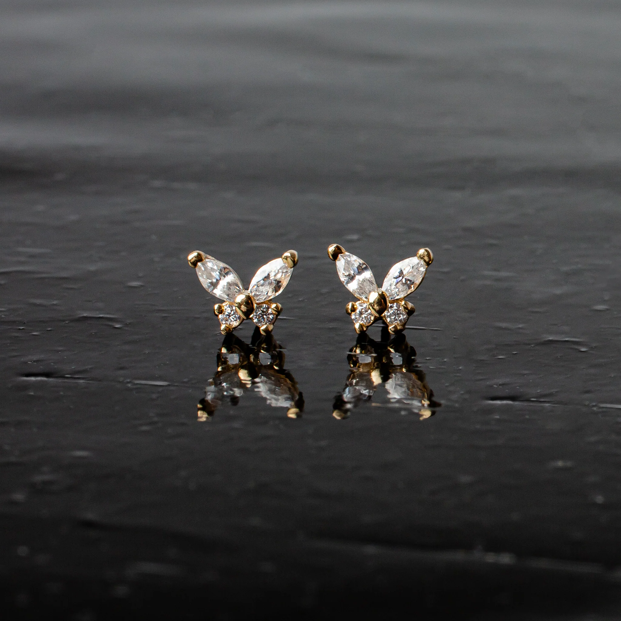Flutter Crystal Butterfly Flat Back Sleeper Earrings - 14k Solid Gold